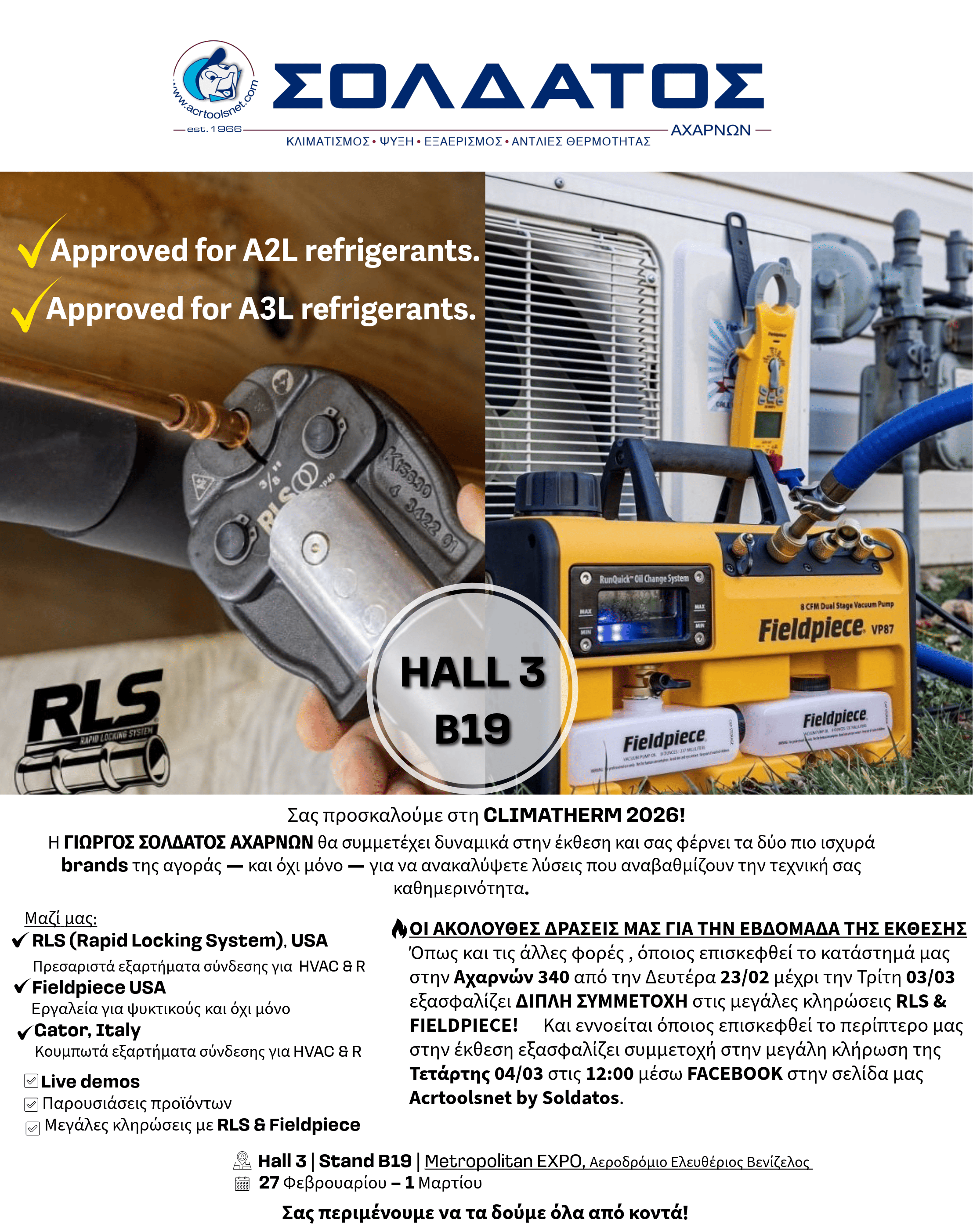 Μάρκα: ROTHENBERGER (Germany) Κωδ. είδους: 50.07.068ΚΙΤ ΑΖΩΤΟΥ R170620SP 90bar ROTHENBERGER Σετ εργαλείων για έλεγχο με άζωτο σε HVAC συστήματα και έλεγχο απώλειας πιέσεως από μικρο-διαρροές. Επίσης ..Μάρκα: Other Κωδ. είδους: 29.05.152ΚΟΛΛΑ LOGO ΣΤΙΓΜΗΣ Classic (2gr + 1gr δωρο) .....5,58€Χωρίς ΦΠΑ:4,50€