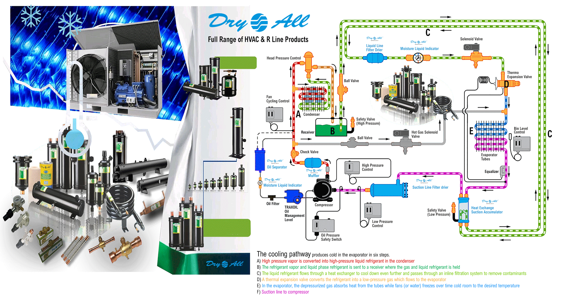 ‘Dry All’ product range includes Widest Range of Filter Driers, Accumulators, Oil Separators, Liquid Refrigerant Receivers, Heat Exchangers, Valves & Accessories. These products are compatible with all synthetic and natural Refrigerants.