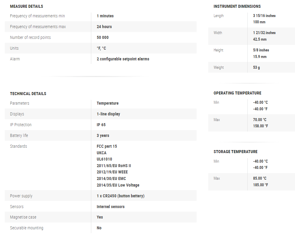 ΦΟΡΗΤΟ ΚΑΤΑΓΡΑΦΙΚΟ ΘΕΡΜΟΚΡΑΣΙΑΣ, με oθόνη, 1 εσωτερικό αισθητήρα NTC, -40+70C, IP65, 53gr, 50000 καταγραφές (1 min), δωρεάν λογισμικό, μαγνητική ράχη, 2 ρυθμιζόμενες περιοχές alarm, οθόνη υγρών κρυστάλλων 1ας γραμμής (LCD), αντικλεπτική υποδοχή, λειτουργεί με 1 μπαταρία x CR2450 (button battery).