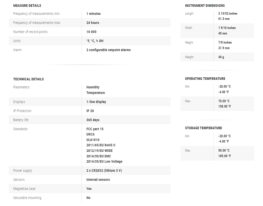 ΦΟΡΗΤΟ ΚΑΤΑΓΡΑΦΙΚΟ ΘΕΡΜΟΚΡΑΣΙΑΣ & ΥΓΡΑΣΙΑΣ με oθόνη, 1 εσωτερικό αισθητήριο, -20/+70C, IP20, 16000 καταγραφές (1 min), δωρεάν λογισμικό, μαγνητική ράχη, 2 ρυθμιζόμενες περιοχές alarm, οθόνη υγρών κρυστάλλων 1ας γραμμής (LCD), αντικλεπτική υποδοχή, λειτουργεί με 2 μπαταρίες x CR2032 (lithium 3 V).