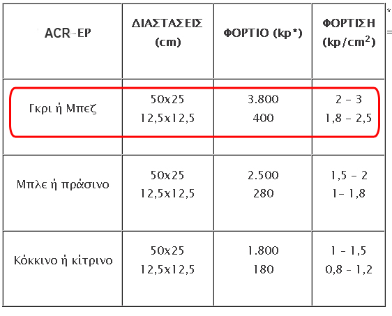 Oι υπάρχουσες διαμήκεις οπές αυξάνουν την υποχώρηση και βελτιώνουν την απορρόφηση των κραδασμών. Διατίθεται σε τρεις διαφορετικές σκληρότητες, έτσι ώστε να επιτυγχάνεται βέλτιστη απόσβεση για διαφορετικά φορτία. Για περιπτώσεις έκθεσης σε ηλιακή ακτινοβολία, επαφή με ελαιώδη υγρά συνιστάται,η επιλογή των ACR - EP νεοπρενίου (Μπεζ, Πράσινο, Κίτρινο). Μπορούν να χρησιμοποιηθούν σε επάλληλες στρώσης με παρεμβολή χαλυβδοελάσματος για μείωση της ιδιοσυχνότητας έως τα 4 Hz(ACR - EP). Διατίθενται διαγράμματα με τα δυναμικά χαρακτηρίστηκα του κάθε αντιδονητικού εφέδρανου καθώς και πιστοποιητικά κτυπογενούς ηχομόνωσης από το Ε.Μ.Π. σύμφωνα με το ISO 140.6 και ISO 717.2.